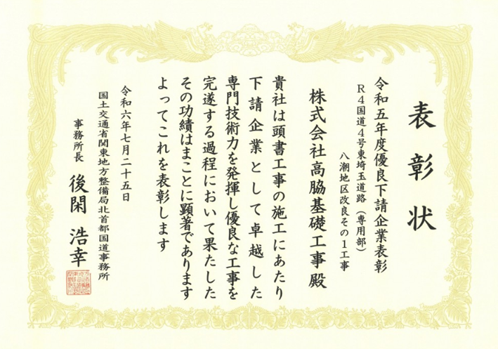 1960年の創業以来、一貫して基礎工事を専門としてきた当社は、表に出る派手さこそないものの、「縁の下の力持ち」として社会インフラや人々の生活を支え続けてまいりました。国内外でのインフラ整備はもちろん、災害発生時の緊急要請にも対応しており、直近では令和7年1月に発生した「八潮陥没事故」に対する緊急工事にも携わっております。 また、これまで当社が施工した工事についても各所より表彰を受けており、令和6年には「国道4号東埼玉道路八潮地区改良その1工事」において、国土交通省より『優良下請企業表彰』を受賞いたしました。 このように、社会インフラの安全・安心に深く関わる重要なプロジェクトにご要請をいただき、参画できることは、私たち社員にとって大きな誇りであり、仕事へのモチベーションにもつながっております。